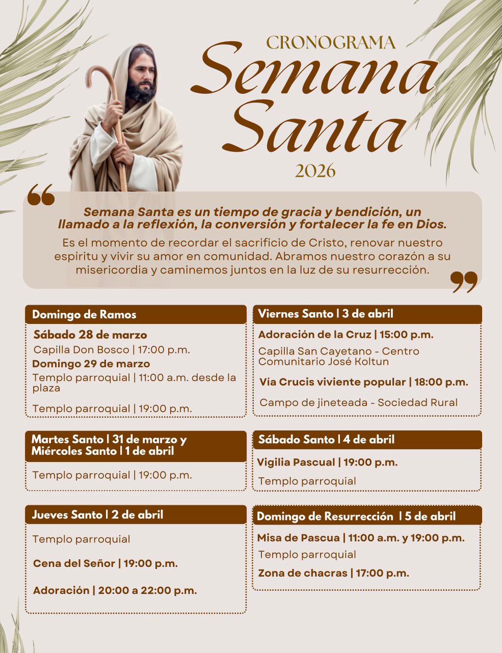 Este año, bajo el lema de renovar nuestro espíritu y caminar juntos en la luz de la resurrección, los invitamos a participar activamente de las celebraciones que hemos preparado. Desde la bendición de ramos hasta la alegría de la Pascua, cada encuentro es una oportunidad para recordar el sacrificio de Cristo y abrir nuestro corazón a su misericordia.